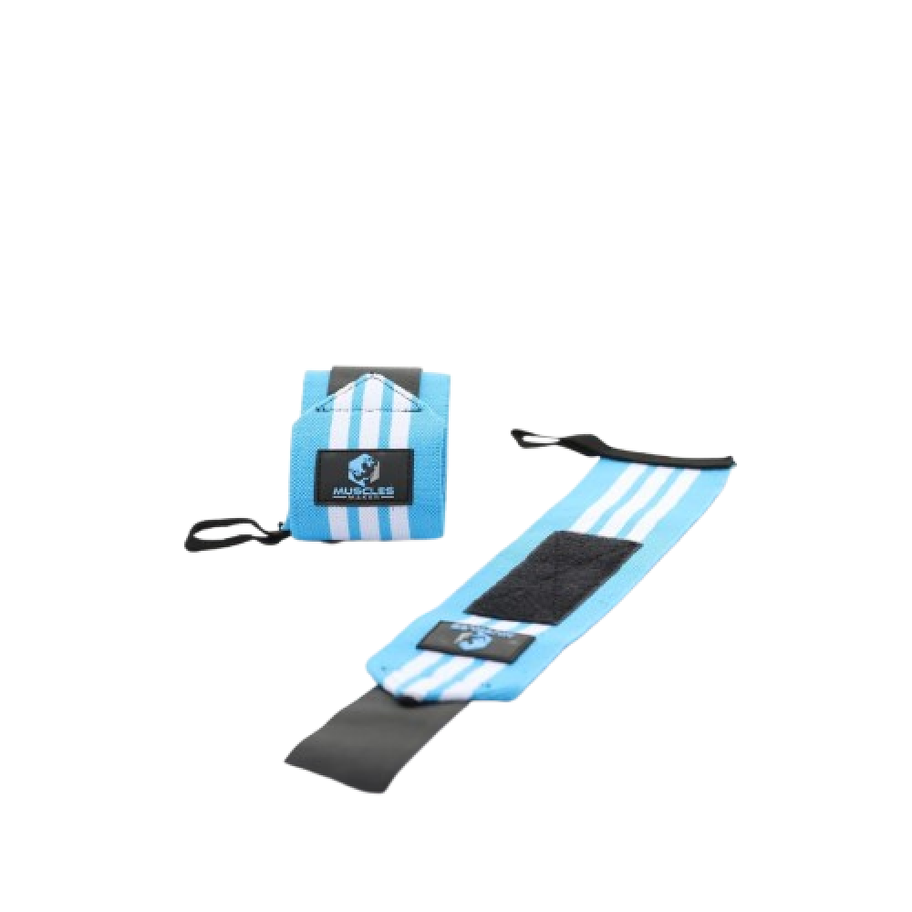 هذه هي أشرطة معصم لرفع الأثقال (Wrist Wraps) مصممة خصيصًا لدعم معاصمك وحمايتها أثناء رفع الأثقال. تتميز بلونها الأزرق الفاتح والأبيض الجذاب وتصميمها الرياضي.