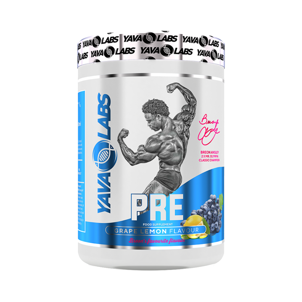 Yava Labs Pre Workout بنكهة العنب والليمون هو مكمل غذائي مصمم للاستهلاك قبل التمرين لتعزيز الطاقة، والتركيز، والأداء الرياضي، وهو مدعوم من قبل بطل كمال الأجسام بريون أنسلي