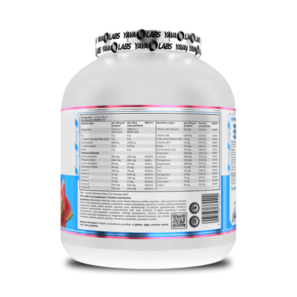 هو عبوة كبيرة من مسحوق مكمل غذائي من إنتاج شركة "Yava Labs" ويحمل اسم "Vita Carb". يأتي في عبوة بيضاء شفافة مع ملصق أزرق وأبيض وتفاصيل ذهبية، ويظهر عليه شعار Yava Labs.